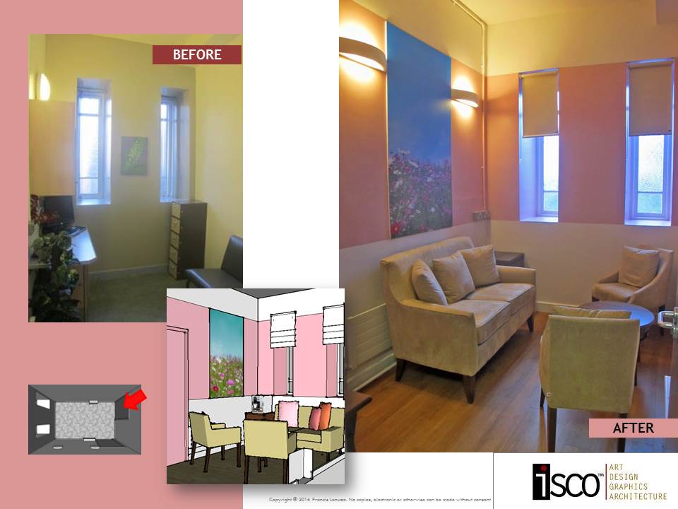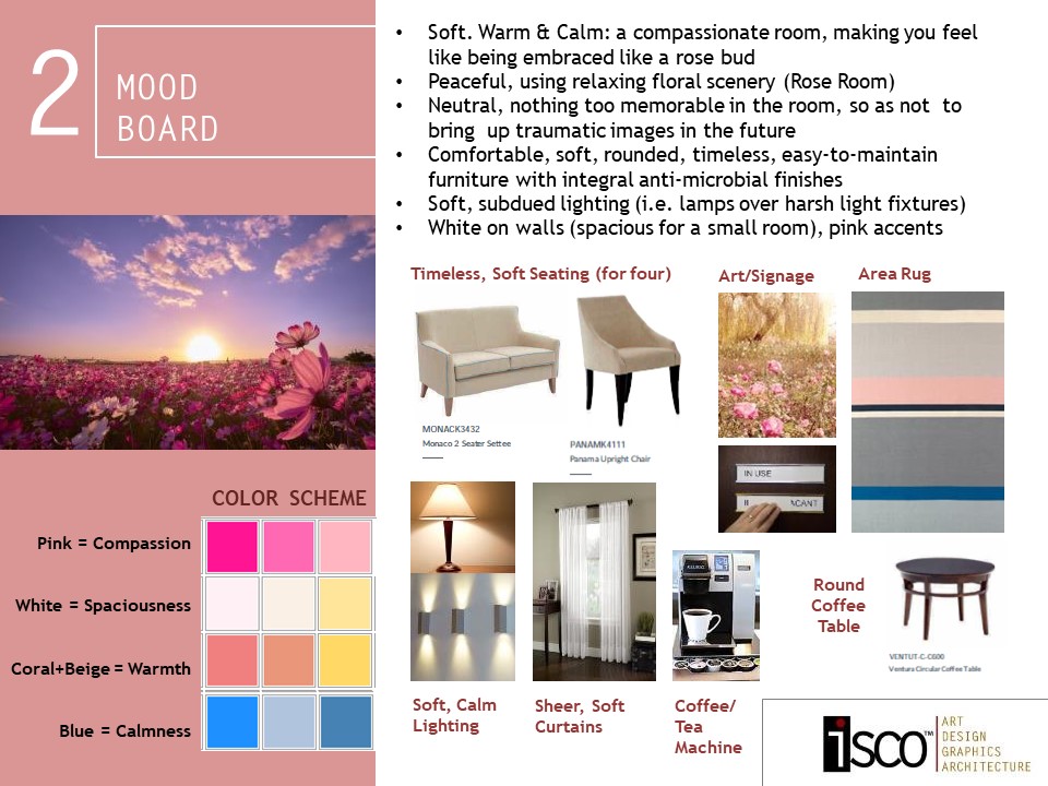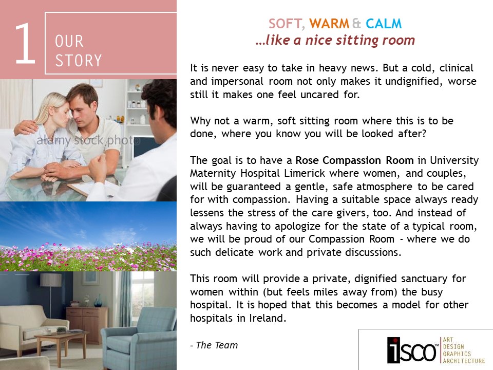 The goal is to have a Rose Compassion Room in University Maternity Hospital, Limerick where women or couples will be guaranteed a gentle, safe atmosphere to be cared for with compassion when being given sensitive pregancy news. Having a suitable, empathic space lessens not only the stress and trauma to the patients, but also to the healthcare professionals and caregivers, too. The Rose Room was inaugurated with the Irish Hospice Foundation (whom through a competitive process provided the funding), and has since provided a private, dignified sanctuary within (but feels miles away from) a typically sterile hospital space. It is hoped that this approach in interior design becomes a model for other hospitals in Ireland.