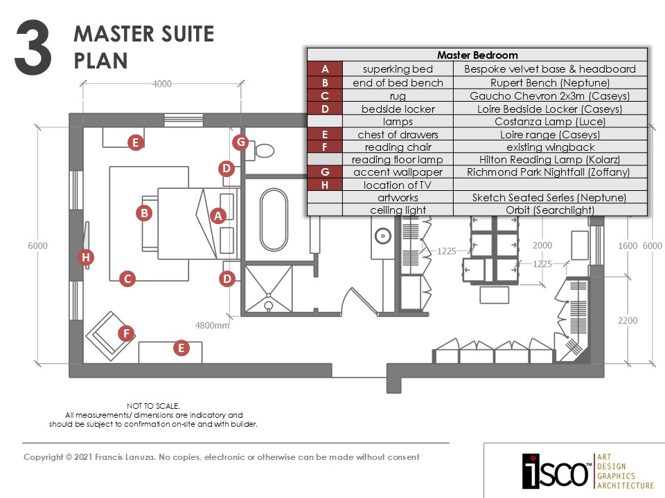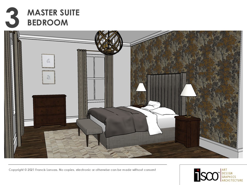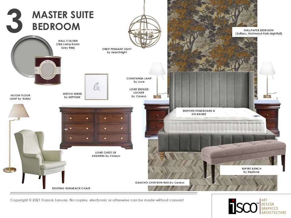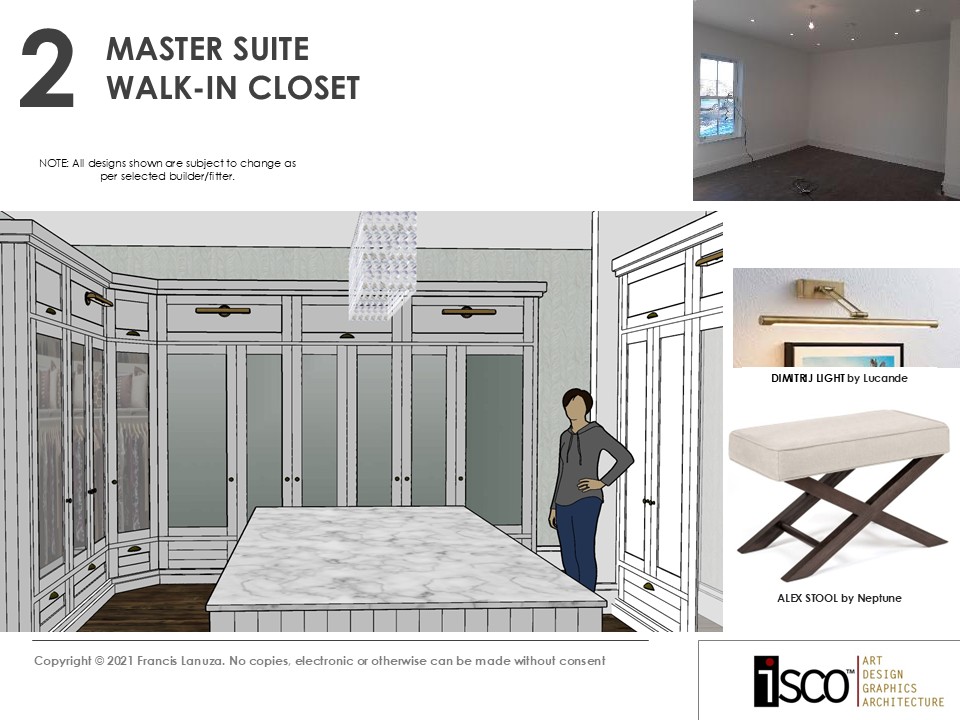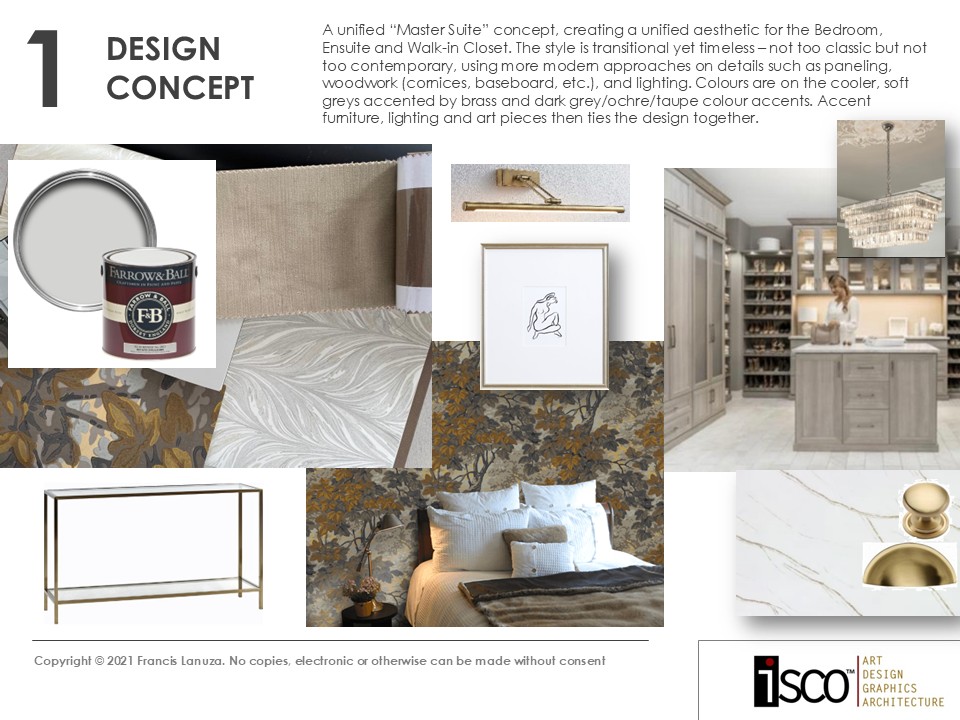A unified “Master Suite” concept, creating a unified aesthetic for the Bedroom, Ensuite and Walk-in Closet. The style is transitional yet timeless – not too classic but not too contemporary, using more modern approaches on details such as panelling, woodwork (cornices, baseboard, etc.), and lighting. Colours are on the cooler, soft greys accented by brass and dark grey/ochre/taupe colour accents. Accent furniture, lighting and art pieces then ties the design together. What sets this project apart was the detail given to the cabinetry design, ensuring a mix of functionality and luxury.